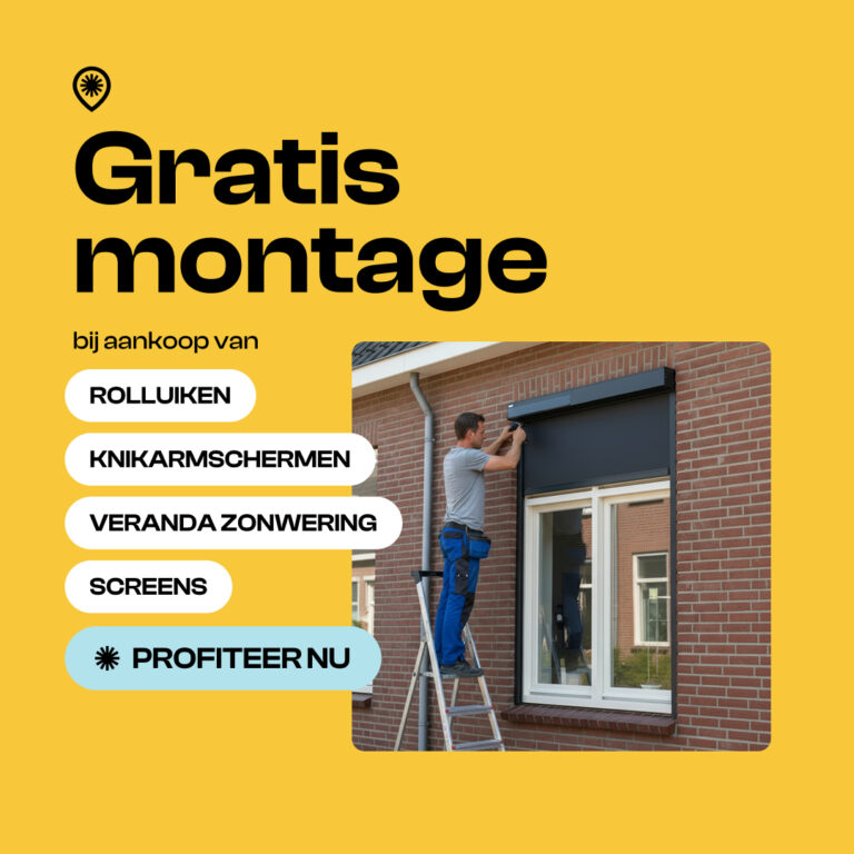 Geen zorgen over de installatie 🛠️. Bij aankoop van rolluiken, screens, knikarmschermen of verandazonwering is gratis montage inbegrepen 💡.
